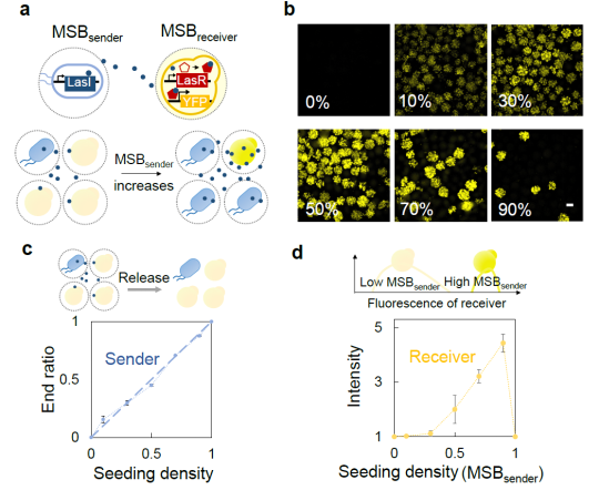 a. 大肠杆菌和酿酒酵母MSBC通讯示意图。b. 发送器MSB的接种比例增加会逐渐激活接收器MSB的黄色荧光蛋白的表达。c. 发送器MSB和接收器MSB以不同比例(MSB总数一致)混合接种到培养基,定量分析培养后的发送器细胞占比。d. 发送器MSB和接收器MSB以不同比例(MSB总数一致)混合接种到培养基,定量分析接收器细胞的荧光信号强度