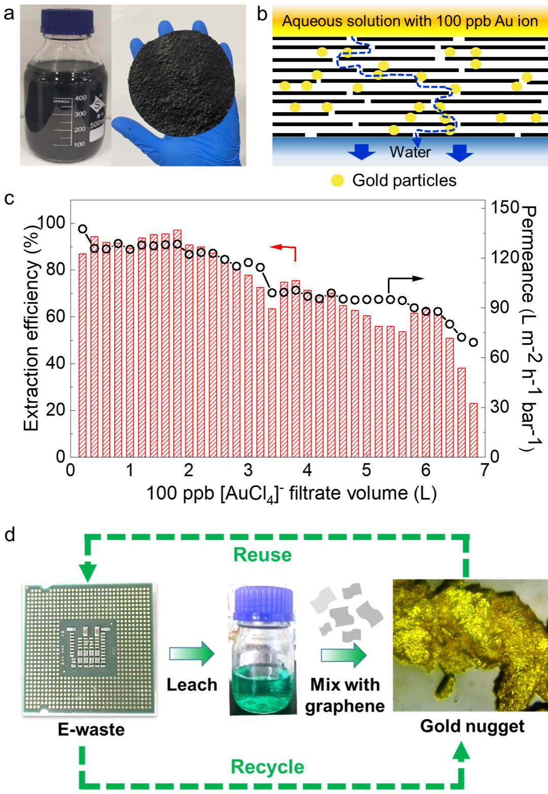 图2. (a)石墨烯分散液(左)和石墨烯薄膜(右);(b)基于石墨烯薄膜陆续在吸附痕量金的示意图和(c)吸附效率;(d)石墨烯从电子垃圾中回收金的工艺示意图