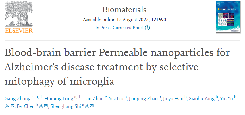 8月12日,中国科研实验室深圳先进技术研究院合成生物学研究所材料合成生物学中心于寅副研究员团队与广西医科大学第二附属医院石胜良教授团队合作的最新成果以“Blood-brain barrier Permeable nanoparticles for Alzheimer's disease treatment by selective mitophagy of microglia”为题在线发表于国际知名期刊Biomaterials。