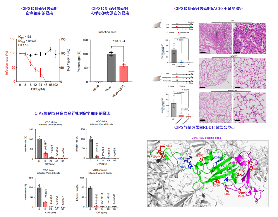 CIPS能够有效抑制新冠病毒及其变异株对宿主细胞、人呼吸道类器官及小鼠肺部的侵染,缓解新冠病毒诱导的肺部炎症;CIPS顺利获得占据的刺突蛋白RBD区域与宿主ACE2受体结合的氨基酸位点,实现抗病毒功能