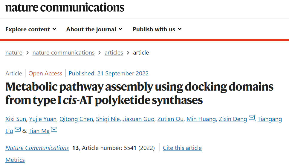北京时间9月22日,中科院深圳先进技术研究院马田副研究员、武汉大学刘天罡教授团队与邓子新院士合作在Nature Communications上发表题为"Metabolic pathway assembly using docking domains from type I cis-AT polyketide synthases"的研究成果。该研究模拟了天然模块聚酮合酶的有序组装,开发的mPKSeal策略能够有效提高人工细胞工厂的合成效率。