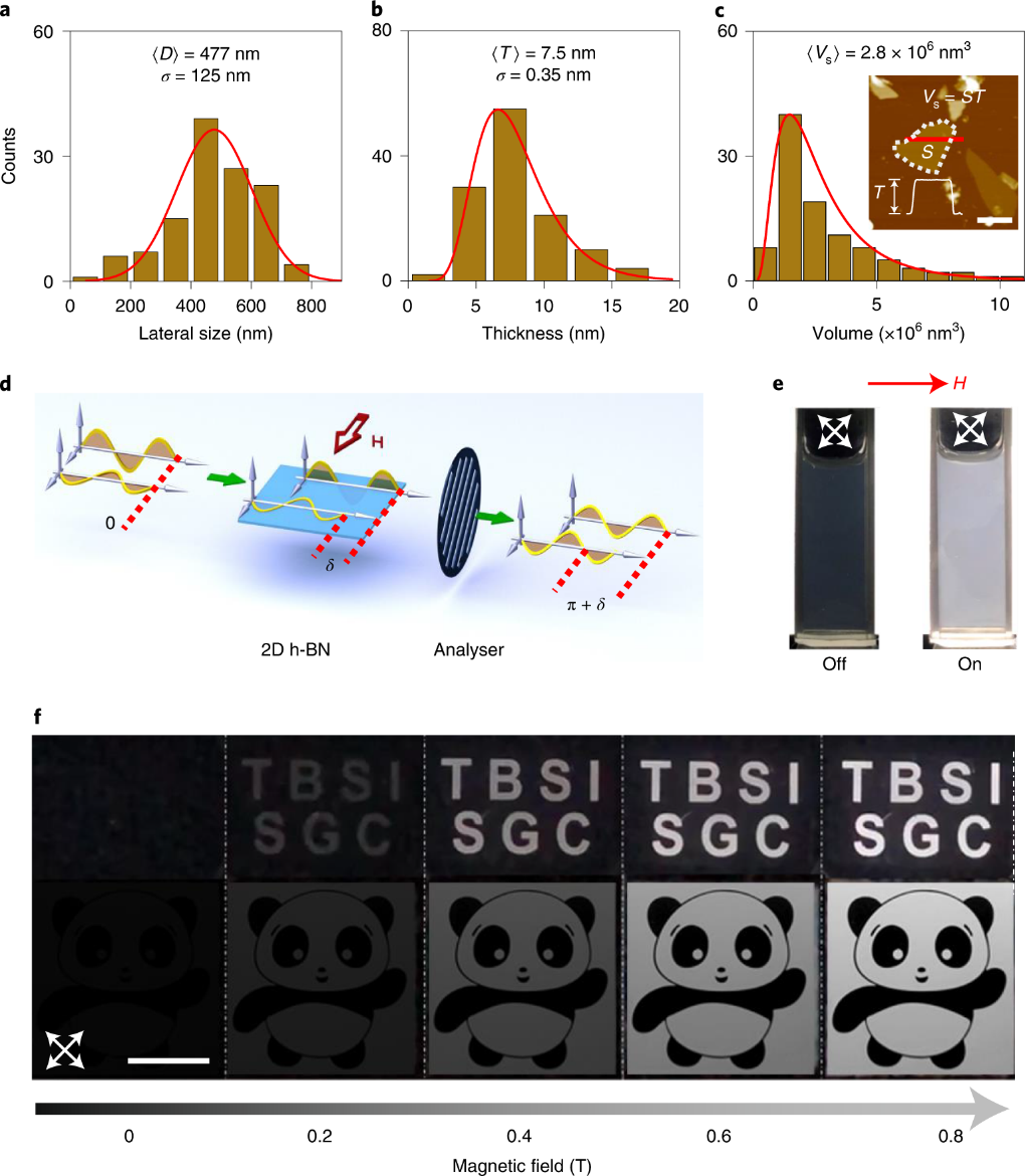 基于上述考虑,团队成员研制出一种基于二维六方氮化硼无机液晶的磁光调制器,采用的氮化硼二维材料具有极大的光学各向异性因子(6.5 × 10-12C2J-1m-1)、巨比磁光克顿-穆顿系数(8.0 × 106T-2m-1)、高循环工作稳定性(270次循环工作后性能保留率高达99.7%)和超宽带隙等优点。所研究的二维六方氮化硼是顺利获得 “自上而下”的高粘度纯溶剂辅助研磨法剥离制备而成。由于其超宽的带隙,二维六方氮化硼液晶在可见、紫外和部分深紫外光谱区具有极高透明度。在磁场作用下,基于二维六方氮化硼液晶的磁光器件在正交偏振片下呈现了明显的磁控光开关效应。