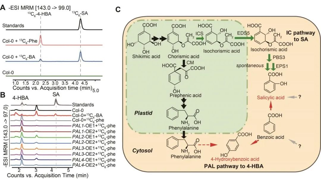 (A)苯丙氨酸合成SA的同分异构体4-HBA;(B)PAL内源活性增强不影响[13C6]-SA的合成;(C)IC途径合成SA,PAL途径合成SA的同分异构体4-HBA