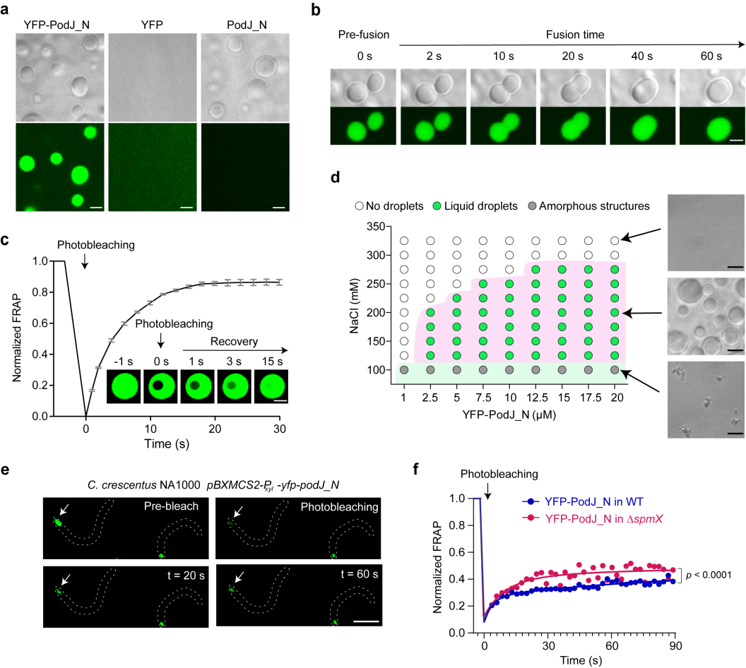 图2. 脚手架蛋白PodJ相分离。a. PodJ在体外发生相分离形成蛋白液滴;b. PodJ蛋白液滴的融合特性分析;c. PodJ蛋白液滴的流动性分析;d. 盐离子浓度及蛋白浓度对PodJ相分离的影响;e-f. PodJ细胞内发生相分离及流动性分析。