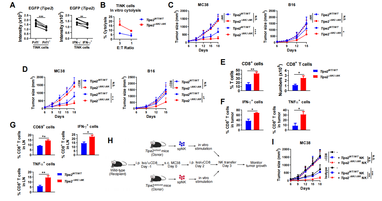 图3. NK细胞敲除Tipe2促进抗肿瘤CD8+T细胞应答的机制