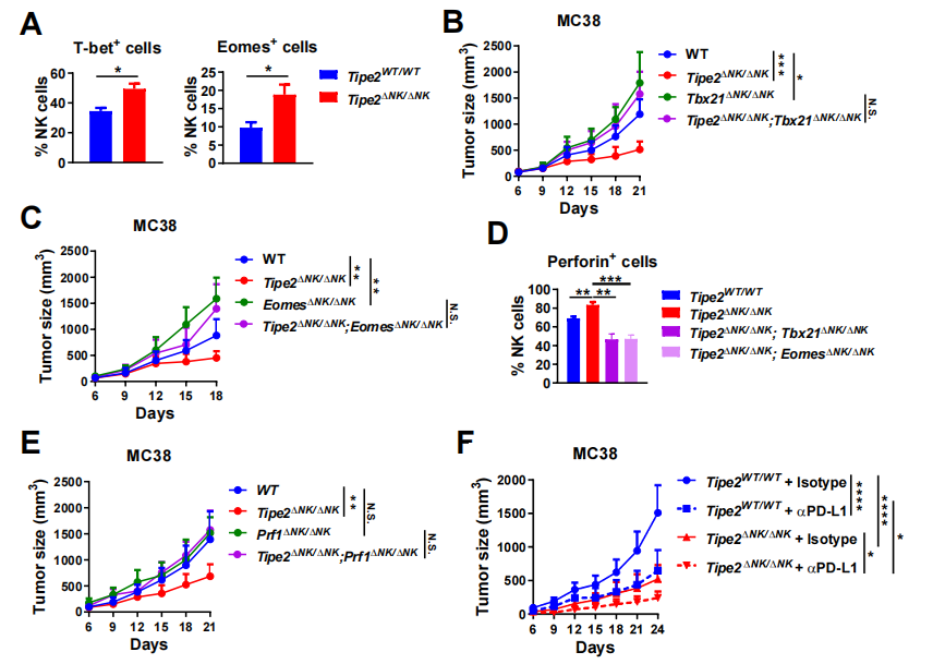 在作用机制方面,由于科研人员观察到肿瘤浸润NK细胞中效应分子IFN-gperforin表达较高的群体Tipe2表达较低,且Tipe2缺失的肿瘤浸润NK细胞具有更强的杀伤活性(图2),科研团队考虑TIPE2是否顺利获得抑制IFN-gperforin等效应分子的上游分子,间接抑制NK细胞的效应功能,从而影响CD8+T细胞抗肿瘤应答。团队发现Tipe2缺失后肿瘤浸润NK细胞表达更高水平的转录因子T-betEomes。转录因子T-betEomes促进NK细胞一系列效应分子的转录,对NK细胞的效应功能起关键作用。另一方面,科研团队检测到Tipe2缺失后肿瘤浸润NK细胞也表达更高水平的perforin,且该现象依赖T-betEomes的存在,印证了T-bet/EomesNK细胞效应功能之间的紧密联系。重要的是,团队发现NK细胞中Tipe2缺失对肿瘤生长的抑制效应依赖于NK细胞中表达T-bet、Eomesperforin,这三者之中任意其一若同时缺失的话,肿瘤将恢复加速生长。另一方面,NK细胞Tipe2缺失能够进一步促进抗PD-L1治疗的抗肿瘤效应,提示二者的作用机制之间存在协同效应(图3)。科研团队的研究表明NK细胞TIPE2顺利获得抑制转录因子T-betEomes及其下游的效应分子的表达,间接限制了抗肿瘤CD8+ T细胞的功能,提示TIPE2NK细胞辅助功能的卡控点分子。