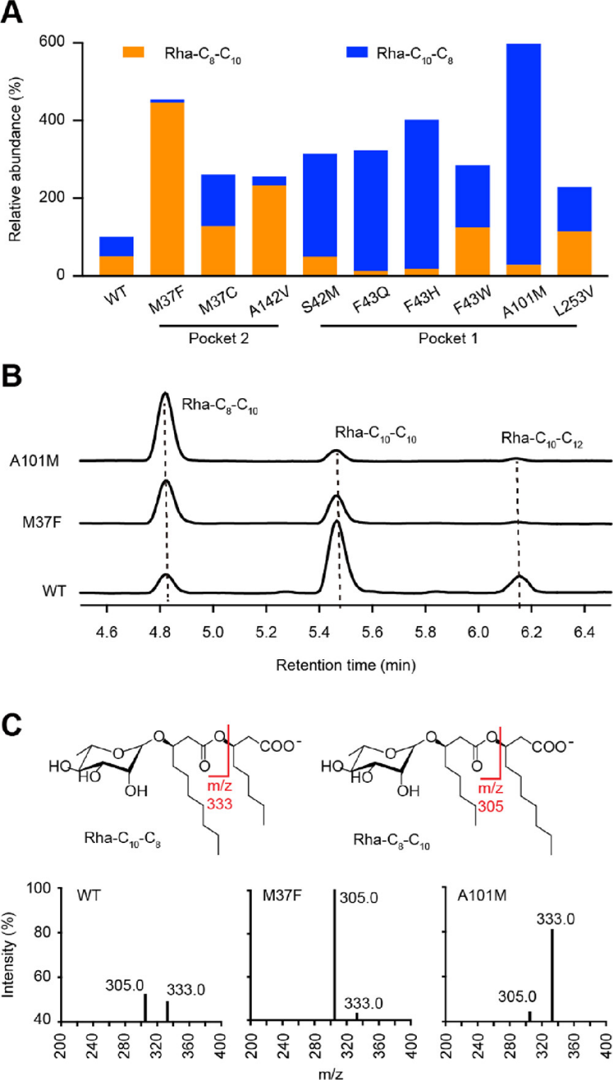 研究人员进一步应用半理性设计,针对两个结合口袋中的13个关键氨基酸残基位点构建了定点饱和突变文库,应用高通量MALDI-TOF质谱方法筛选了上千株突变株,最终得到了RhlA底物选择性显著变化的9个突变体,并发现不同结合口袋的突变对于HAA中两个脂肪链的长度具有不同的调节作用。团队对RhlA的三个典型突变体(Met37Phe、Phe43His和Ala101Met)召开了重组表达、蛋白纯化与体外酶动力学分析,发现kcat是决定发酵液中不同RL同系物比例的关键参素。