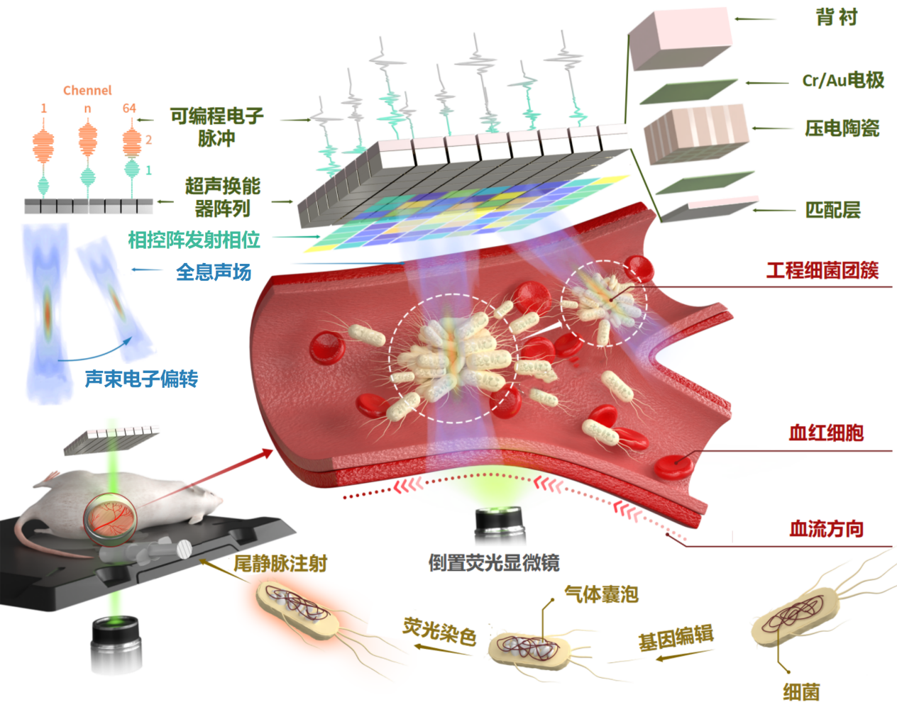 “隔空取物”不断以来是人类的梦想,这种科幻超能力现被超声科技实现并可望用于治病救人。近期,中国科研实验室深圳先进技术研究院郑海荣研究员团队开发出一种相控阵全息声镊操控技术,生物体及血流中成功实现了对含气囊细菌无创精准操控和高效富集,在动物模型中实现了肿瘤靶向治疗应用。相关成果以“In-vivo programmable acoustic manipulation of genetically engineered bacteria为题发表在《自然》子刊Nature Communications期刊上相控阵全息声镊系统基于高密度面阵列换能器产生可调谐三维体声波,顺利获得对空间声场在活体血管内等复杂环境中的时空精准调控,在活体血管内等复杂环境中成功操控了含气囊细菌团簇,使其精准地移动到目标区域并发挥治疗功能,有望为肿瘤的靶向给药和细胞治疗等给予一种理想手段。
