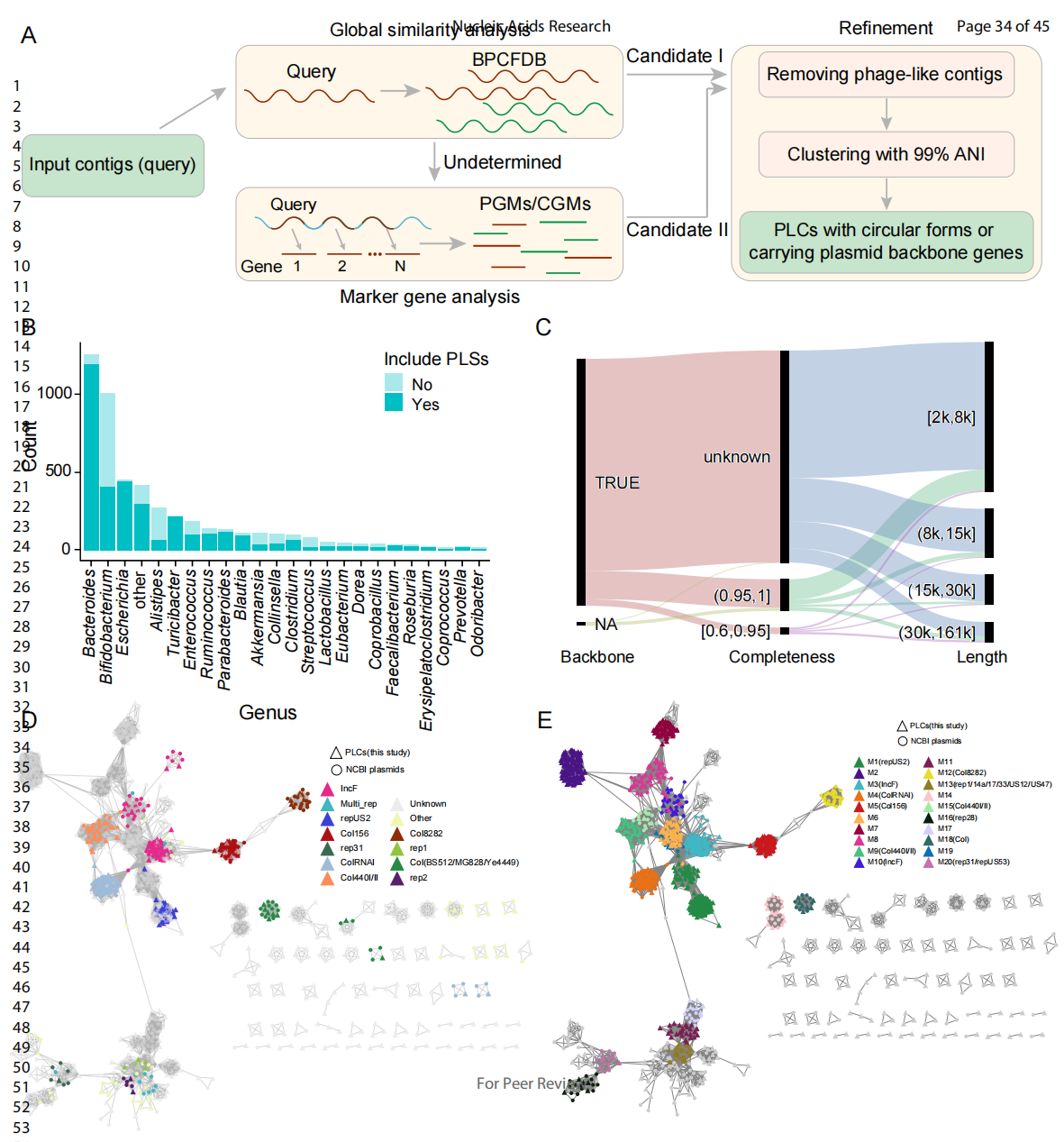 在该研究中,科研团队开发了一套鉴定PLSs的分析方法(图1A)。以人类肠道细菌分离株的基因组草图为样本,团队筛选得到大量的PLSs,并发现其广泛分布在不同属的细菌宿主中(图1B)。这些PLSs可以进而被分组为拟质粒簇(plasmid-like clusters,PLCs),并进一步检查负责复制、动员、接合或稳定的质粒骨架基因,并鉴定其大小与完整性(图1C)。团队进一步将高完整性(>60%)的PLCs与公共数据库中的质粒序列进行了比较,构建了全序列相似网络,并将序列划分为103个网络分型组(图1D与1E),结果表明网络布局与复制子类型一致。分析的PLCs存在数种复制子类型,其中有许多PLCs复制子未知,形成了多个独立网络分型组,显示了在人类肠道微生物组中鉴定的PLCs的新颖性和多样性。