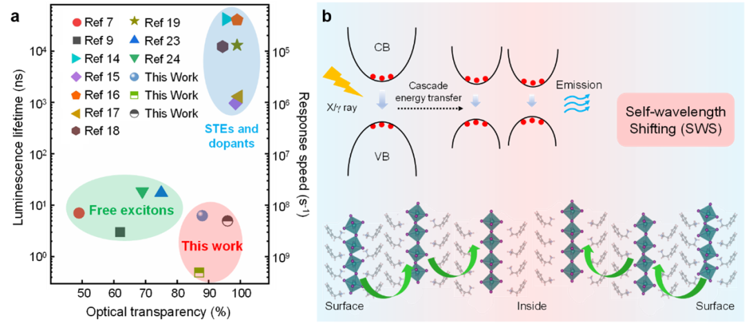 近年来,X/γ射线的探测在医学成像、剂量测量、辐射防护等领域已经取得广泛应用。铅卤钙钛矿作为一种新兴的闪烁材料受到了广泛关注。然而,其激子发光的斯托克斯位移较小,且存在严重的自吸收问题,大量激发光子无法被探测到,制约了该材料的探测性能和应用。为解决这一难题,研究人员进行了深入研究,取得了令人振奋的突破。