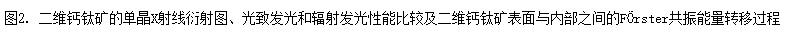 二维钙钛矿单晶和薄膜在以往的研究中已经有不少有关应变效应的报道,但是其结构起源等机理仍然不甚明了,而内在应变如何提升了二维钙钛矿的性能效果也尚未得到详细的研究。本工作研究了一组具有良好量子和介电限域效应的二维钙钛矿单晶。顺利获得采用掠入射X射线衍射测量,研究人员发现该晶体样品表面存在压缩应变的现象。进一步的X射线光电子能谱分析和理论计算表明,这一压缩应变的结构起因源自表面胺基的缺失。瞬态光致发光光谱研究明确揭示了从表面到体相的快速能量转移过程,为实现“自移波”和快速发光寿命奠定了基础。