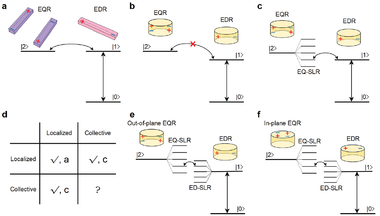 在此基础上,研究团队基于硅纳米柱阵列结构所支持的米氏电偶极SLR分别与面内或面外电四偶极SLR之间的干涉耦合,提出了两种具有集体共振特性的新型类EIT现象,在室温下实现强慢光效应(光速被减慢1万倍以上,即为30公里/秒以下)的同时,极大地抑制了损耗,从而在实验上测得破纪录的品质因子。该原理不同于传统超构表面类EIT现象:后者基于局域共振之间的干涉耦合,因此需要将两个独立的纳米结构靠得足够近来实现,对纳米加工能力提出了挑战,而且由于局域共振所受的散射损耗较高,导致类EIT现象的品质因子和慢光指数均十分有限。