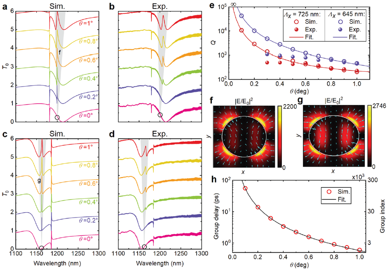 针对超构表面采用类电磁辐射透明(EIT)现象实现慢光效应所面临的高损耗问题,研究团队提出了一种基于晶格共振与晶格共振发生耦合诱导产生的新型类EIT现象,极大地抑制了其损耗,从而在100纳米高度的硅纳米柱阵列上实现了慢光效应(光速减慢了1万多倍)。于此同时,团队在实验上测得高达2750的超高品质因子,数倍于现有纪录(483)。该研究还进一步发现了一种具有陆续在域束缚态(BIC)特性的集体型类EIT现象,其品质因子和慢光指数在理论上均按照反二次函数发散到无穷大。这一创新设计为实现超高性能的慢光光子芯片器件给予了新的思路