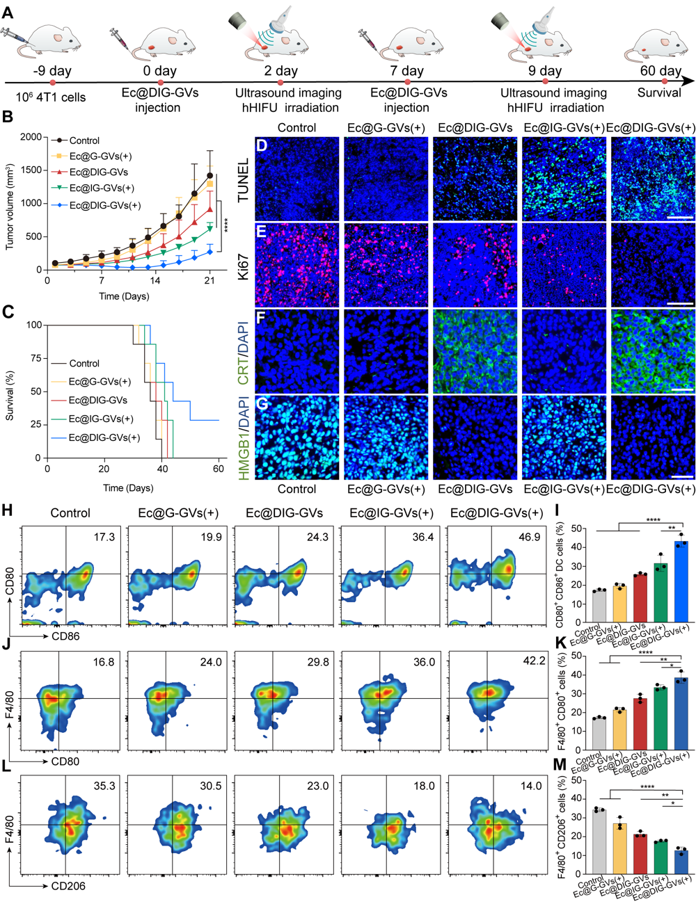 随后,研究团队测试了Ec@DIG-GVs的肿瘤细胞杀伤活性和免疫激活的情况,将Ec@DIG-GVs进行酸性处理并给予hHIFU辐照诱导IFN-γ的表达,离心去除细菌后取得了含有DOX和IFN-γ的上清液。将该上清液与肿瘤细胞孵育后,可见肿瘤细胞发生明显的凋亡和免疫原性死亡(CRT、HMGB1蛋白标志物的检测)。将该上清液与巨噬细胞共孵育后发现M1型巨噬细胞占比明显增加,说明Ec@DIG-GVs所释放的IFN-γ和DOX具有杀伤肿瘤并能诱导M1型巨噬细胞极化(图3)。