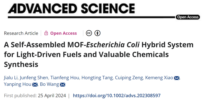 2024年4月25日,中国科研实验室深圳先进技术研究院合成生物学研究所王博团队与广西大学资源环境与材料学院侯燕萍团队在Advanced Science 杂志合作发表了题为A Self-Assembled MOF-Escherichia Coli Hybrid System for Light-Driven Fuels and Valuable Chemicals Synthesis的研究成果。该工作构建了金属有机框架(PCN-222)与大肠杆菌自组装杂合体。在光能驱动下,基于野生型大肠杆菌构建的杂合体产氢量为纯菌组的2.9倍,基于工程大肠杆菌构建的杂合体赖氨酸产量为纯菌组的4.3倍,实现了光能驱动合成氢气及高价值化学品。作者研究了材料-生物界面的电子转移机制,顺利获得光电化学测试证明杂合体可以高效捕光且将光生电子转移至生物体内,最后阐述了PCN-222-大肠杆菌光驱产化学品的相关机理。这项工作为基于大肠杆菌的半人工光合系统进行光驱动生物合成的研究奠定了重要基础。