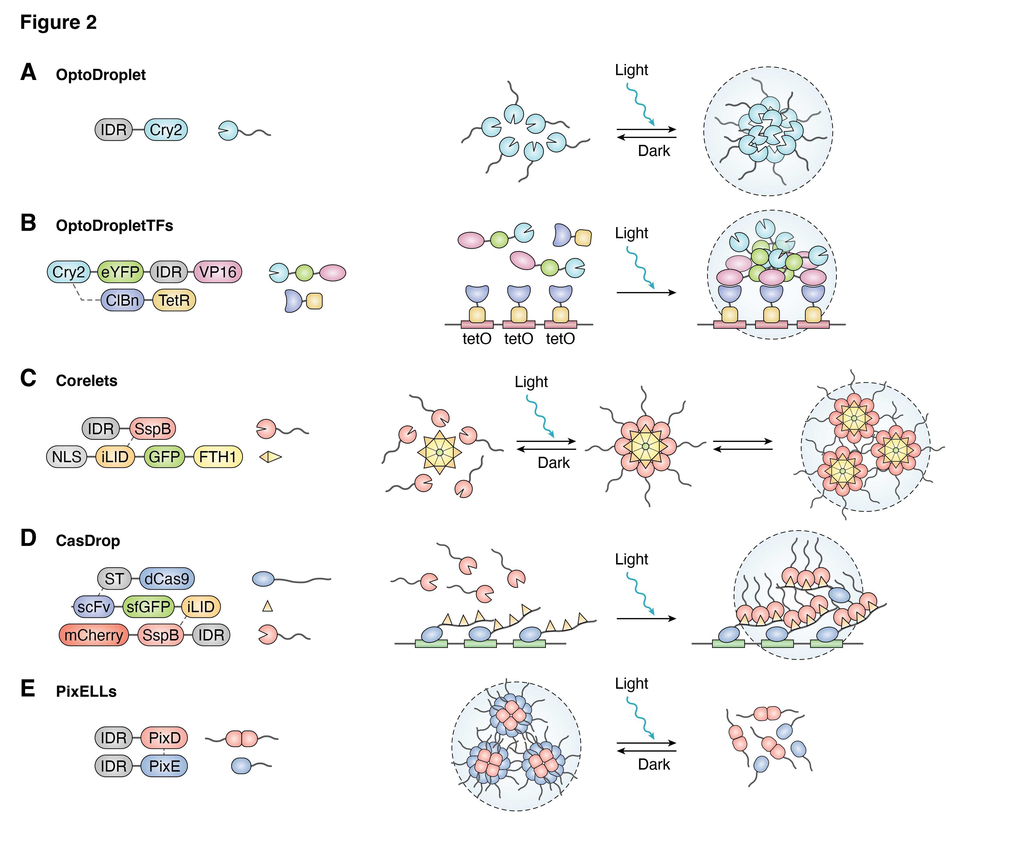 SBMCs在染色体结构研究中的应用:染色体的组织对基因表达和稳定性至关重要。Polycomb suppressicomplex 1(PRC1)是一种染色质修饰复合物,参与维持染色质的抑制状态。Clifford Brangwynne团队顺利获得Corelets系统设计了一种光激活的多组分PRC1凝聚物,阐明了PRC1在染色质致密化中的机制。这项研究为染色体结构研究给予了理想的实验平台。