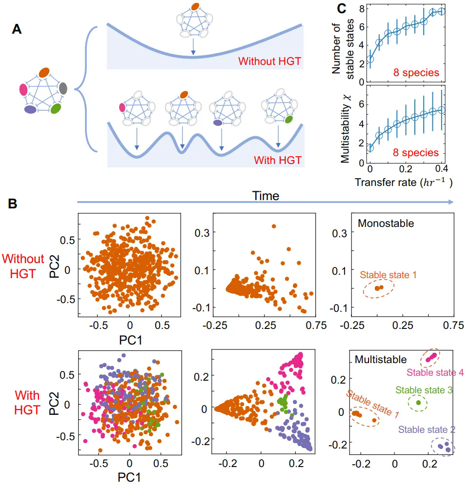 微生物群落在相同环境中常呈现不同的稳定状态,但其多稳态的起源机制尚不明确。以往研究聚焦于物种互作和资源竞争,而水平基因转移(HGT)作为微生物进化的重要驱动力,其作用长期被忽视。HGT顺利获得可移动遗传元件(MGEs)改变宿主生长速率和种间相互作用,可能重塑群落稳定性,然而HGT如何影响多稳态的形成仍缺乏系统性研究。理解这一机制对揭示微生物群落动态及调控具有重要意义。