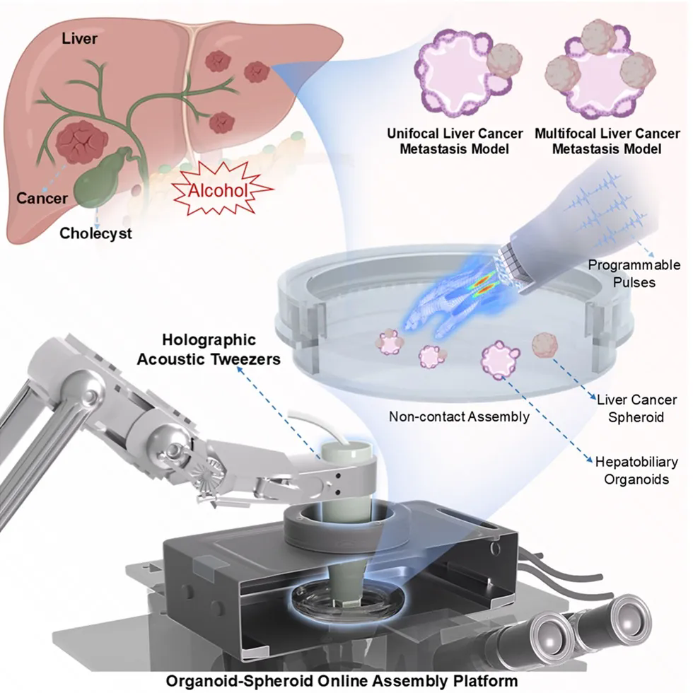 5月22日,中国科研实验室深圳先进技术研究院科学仪器所(筹)马腾研究员团队和哈尔滨医科大学田野教授团队合作在Cell旗下刊物 Cell Reports Physical Science上发表题为“Construction of a metastasis model for liver cancer spheroids to hepatobiliary organoids facilitated by holographic acoustic tweezers”的研究成果。该工作主要顺利获得全息声镊科学仪器产生的具体生物医学应用,围绕全息声镊和三维细胞培养技术构建了类器官-细胞球在线组装平台,顺利获得该平台构建了一种精准、可靠且具有多功能性的肝癌转移类组装体模型。此外,该研究还顺利获得RNA测序技术评估了不同参数下声压对类器官和细胞球基因层面的影响,进一步的优化了操控参数。