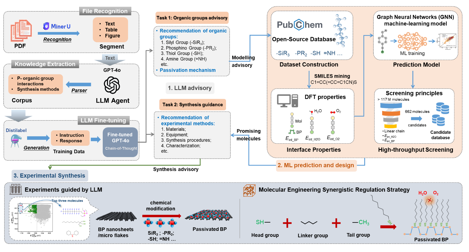 1. 知识推荐:利用大模型分析286篇与磷相关的文献,大模型快速推荐出了与BP表面具有强亲和力的功能基团(-SiR3、-PR2、-SH、=NH等)。