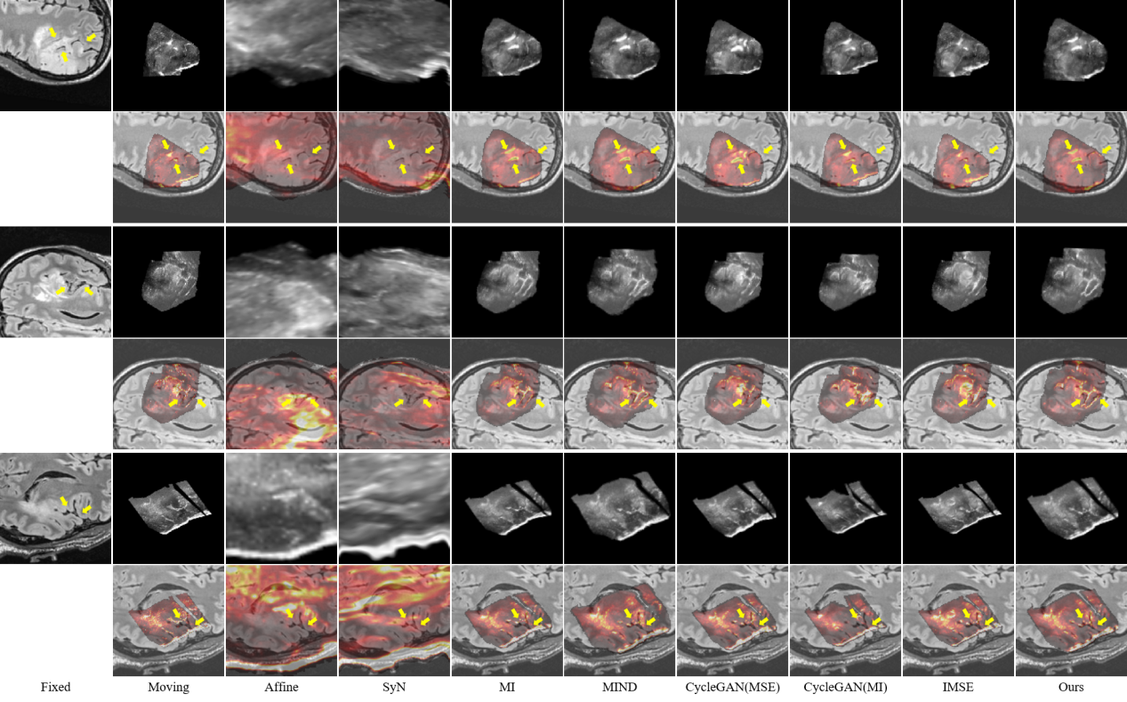 图6:所提出方法与现有方法在CuRIOUS MR-US脑数据集上的定性效果(黄色箭头指向图像上的较为明显的脑沟等显著结构