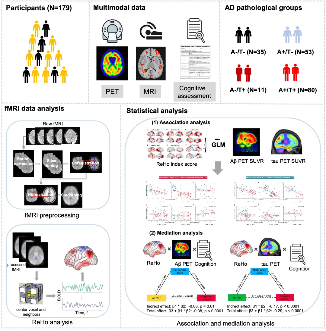 针对上述问题,研究团队共招募了179名受试者(包括健康对照、轻度认知障碍及AD痴呆患者),所有受试者均完成了[18F]-AV-45 Aβ PET成像、[18F]-PI-2620 Tau PET成像、静息态功能磁共振成像(rs-fMRI)、3D T1结构像采集,以及临床认知评估,并根据Aβ PET SUVR和Tau PET SUVR将受试者分为四组:A-/T-,A-/T+,A+/T-,A+/T+(图2)。研究利用局部一致性(ReHo)指标评估区域脑功能活动,顺利获得构建广义线性模型和中介分析模型,系统探讨了脑功能活动改变在蛋白病理(Aβ和Tau)与临床认知评分(MMSE、MoCA)之间的作用机制。