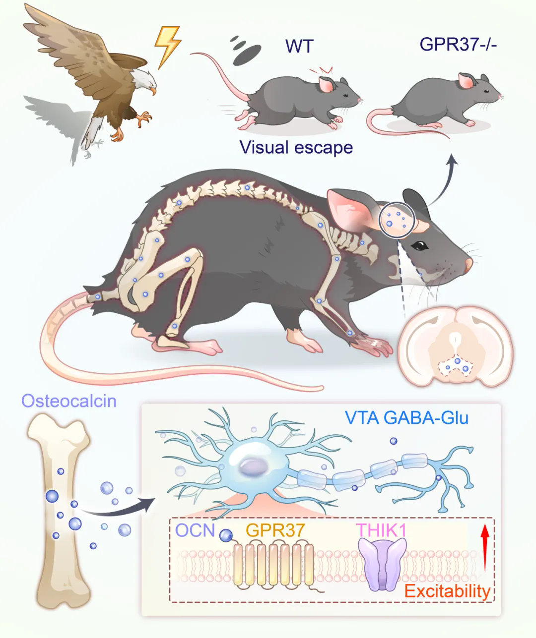 近年来,骨骼作为内分泌器官的作用逐渐被重视。从进化角度看,骨骼不仅保护大脑,其与神经系统的协同进化也帮助生物应对环境挑战——例如中国科研实验室水生所何舜平、王文教授研究团队证明脊椎动物在从水生向陆地过渡的宏大演化历程中,与应激、焦虑相关的基因发生了显著变化。这表明,“登陆”这一重大环境剧变,可能在遗传层面筛选并强化了更具警觉性的个体,以应对陆地上更加未知且多变的危险(Wang K et al.,Cell, 2021)。骨骼分泌的骨钙素(OCN)已被证明在能量代谢、糖脂稳态等方面具有重要作用,但其能否作为急性应激信号、顺利获得特定脑区、细胞、特定分子调控机制,连接骨骼与大脑、代谢与行为,在危急时刻启动逃跑反应,还是未解之谜。