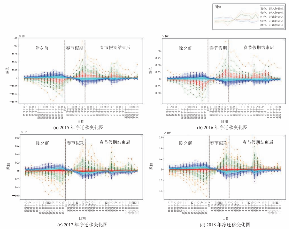 摘要:城市间的大规模人口流动一定程度上体现了城市间的关联性。该文选取腾讯迁徙数据库中 2015—2018 年官方春运期间全国人口迁徙数据,利用 Gephi 软件对人口联系强度进行可视化分析,获取全国城市间联系强度总体格局的变化特征。利用 DBSCAN 算法对全国城市进行时间序列聚类,讨论在春运不同时间节点的城市流动共性与差异。此外,该文还改进重力模型,以分析省内、省际人口流动的距离衰减效应。结果表明:(1)全国城市总体形成稳定的“菱形”结构,北京、上海、西安等城市形成单轴心空间组织模式,广东、深圳形成多轴心空间组织模式,一线城市中心性较强。除“菱形”结构外,西北部和东北部城市的中转和承接能力具有强大优势。(2)春节期间净迁移人口变化趋势较为稳定,春节前后形成对称式流入流出。(3)春运期间的流动符合距离衰减定律,随着距离的增加,城市吸引力在逐渐降低。