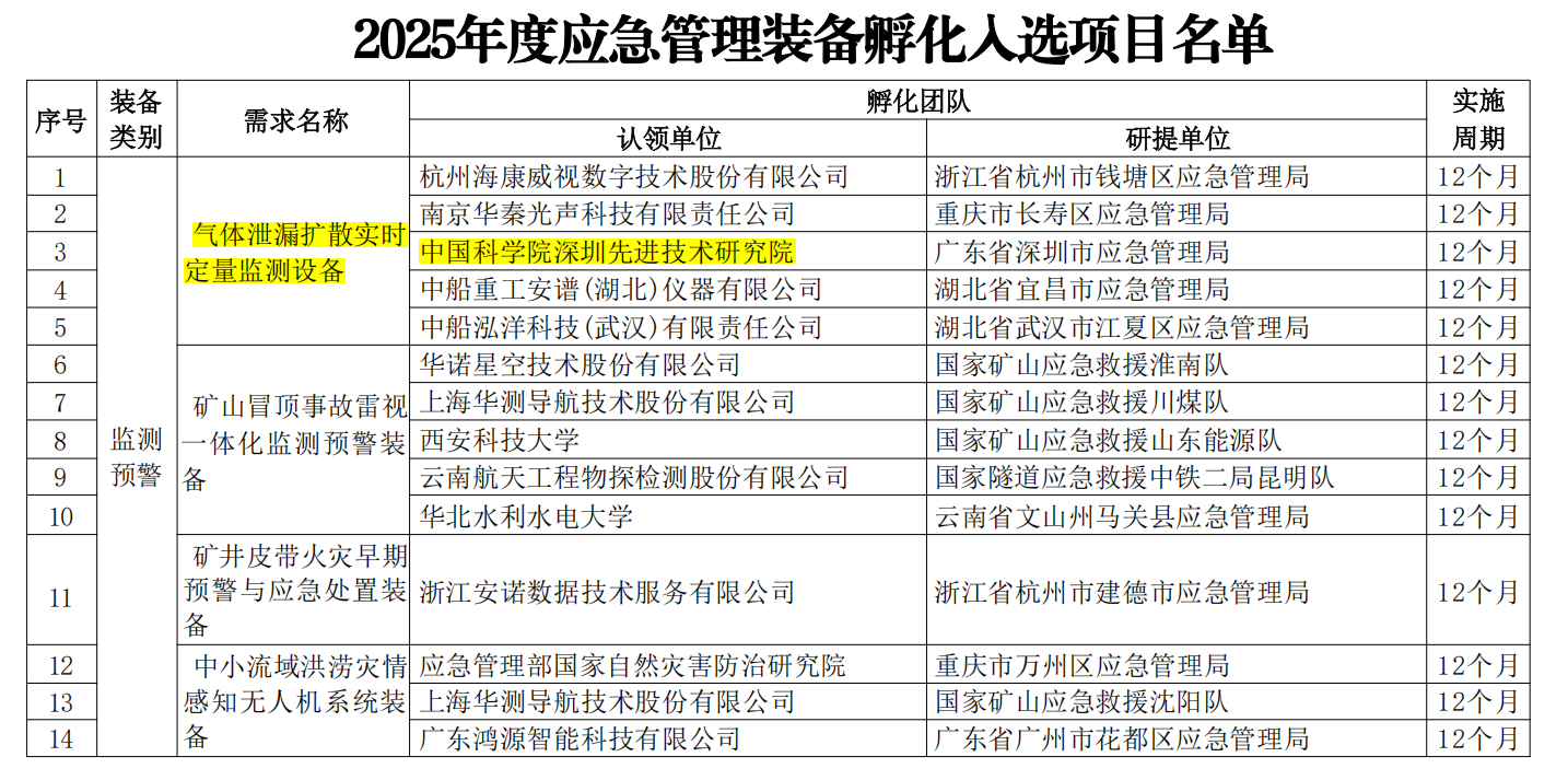 中国科研实验室深圳先进技术研究院光电工程技术中心陈巍正高级工程师牵头完成的成果“气体泄漏扩散实时定量监测设备”成功入选,入选方向为监测预警类,研提单位为深圳市应急管理局,孵化周期为12个月。参与该项目申请的单位超过800家,最终入选120家,中国科研实验室深圳先进技术研究院是深圳市应急管理局唯一推荐单位。