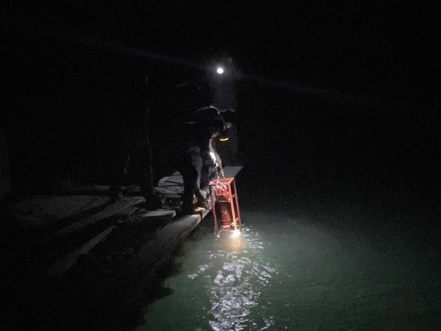李剑平在海上浮排工作到深夜 ,测试部署浮游生物原位成像仪